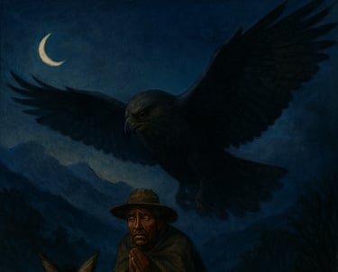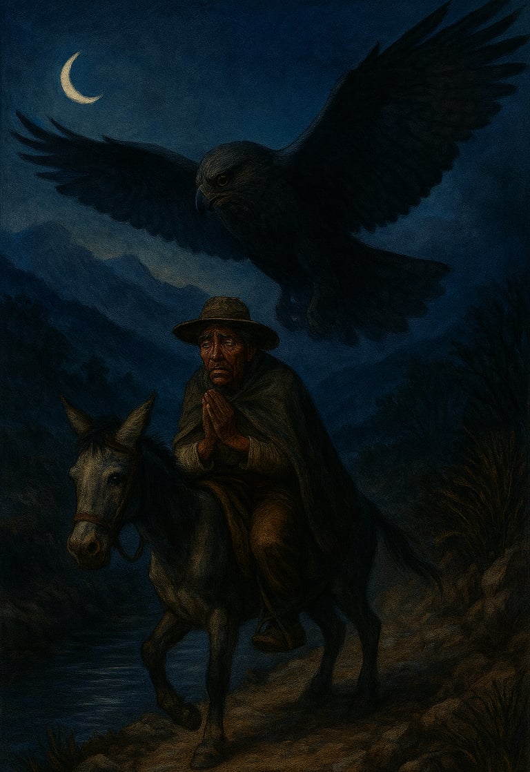 El viajero, presa del miedo, comprendió que no enfrentaba a un ave común, sino a un guardián de los cielos, un espíritu antiguo que habita en las quebradas y cerros de Carrizalillo. Su corazón latía con fuerza, y sintiendo que las fuerzas humanas no bastaban, se aferró a la fe: juntó sus manos y comenzó a rezar.