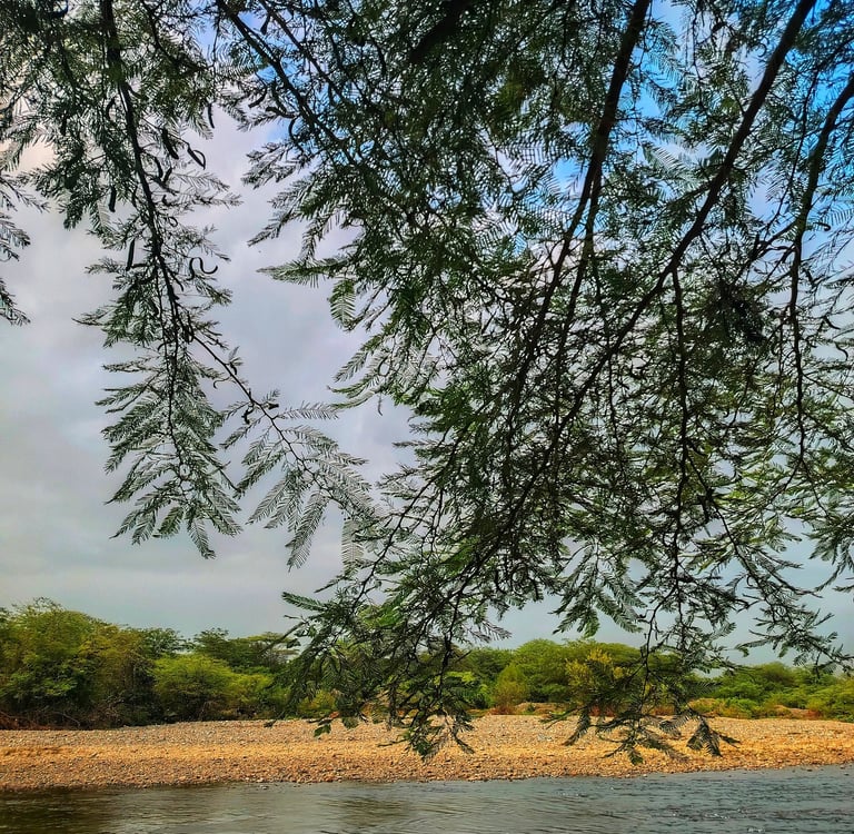 En el caserío de Tejedores, el río corre como una vena de plata que alimenta la tierra y refresca el alma. Sus aguas limpias bajan tranquilas, reflejando el cielo piurano y dando vida a chacras, animales y familias que han aprendido a convivir con su cauce generoso.